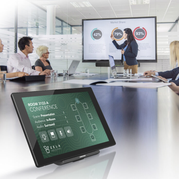 Crestron unveils TST-1080 wireless touch screen for customizable workplace control.