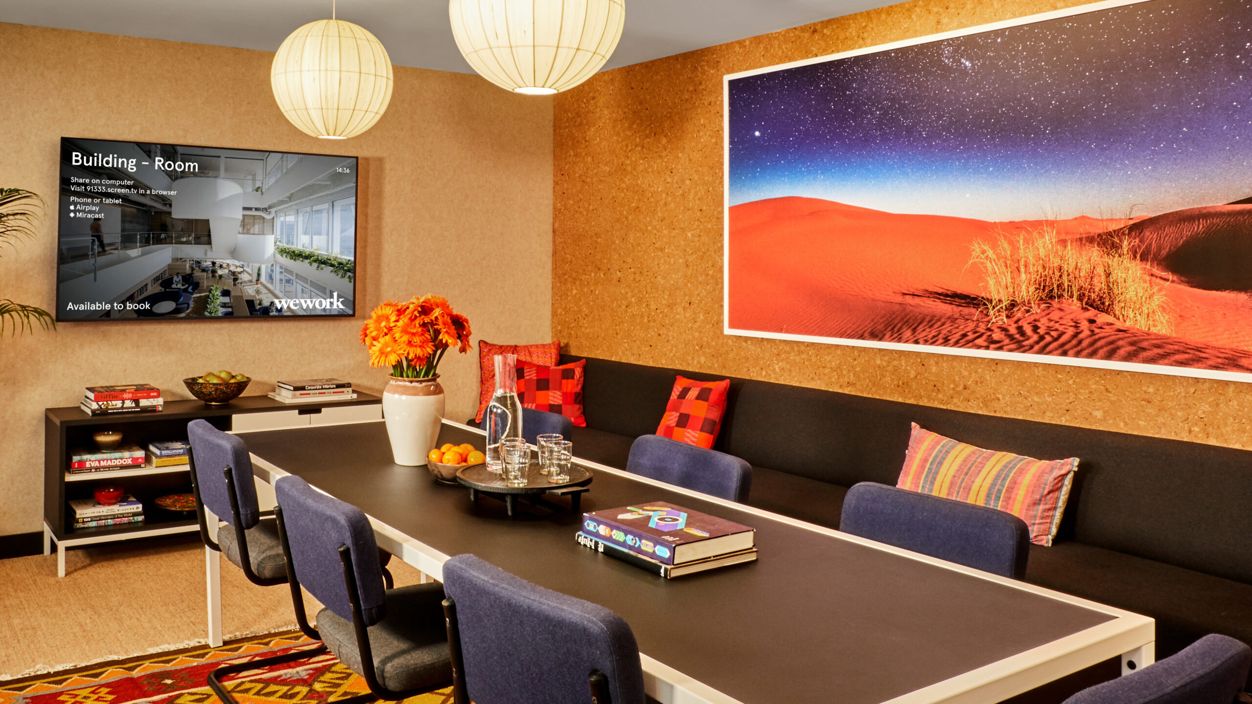 Mersive Solstice’s Dynamic Digital Signage feature is a hosted web page, enabling endless customization. WeWork developed motion sensors to work with the Solstice platform so that if movement is detected in the room, the screen can display a welcome message. If the room is not booked, a screen will pop up that informs the person in the room they need to book it in order to use it. This helps WeWork make more efficient use of space and reduce conference-room squatters.