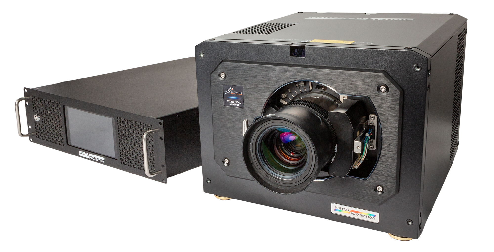 and ease from a projector chassis that’s significantly smaller and lighter than other premium 3-chip DLP projectors on the market. The HIGHlite Satellite MLS weighs just 42 pounds, compared to the 120 pounds of most other projectors in its class and is 83% smaller than its original integrated design; the TITAN Satellite MLS weighs 81 pounds compared to the 200 pounds of most other projectors in its class and is 70% smaller.
