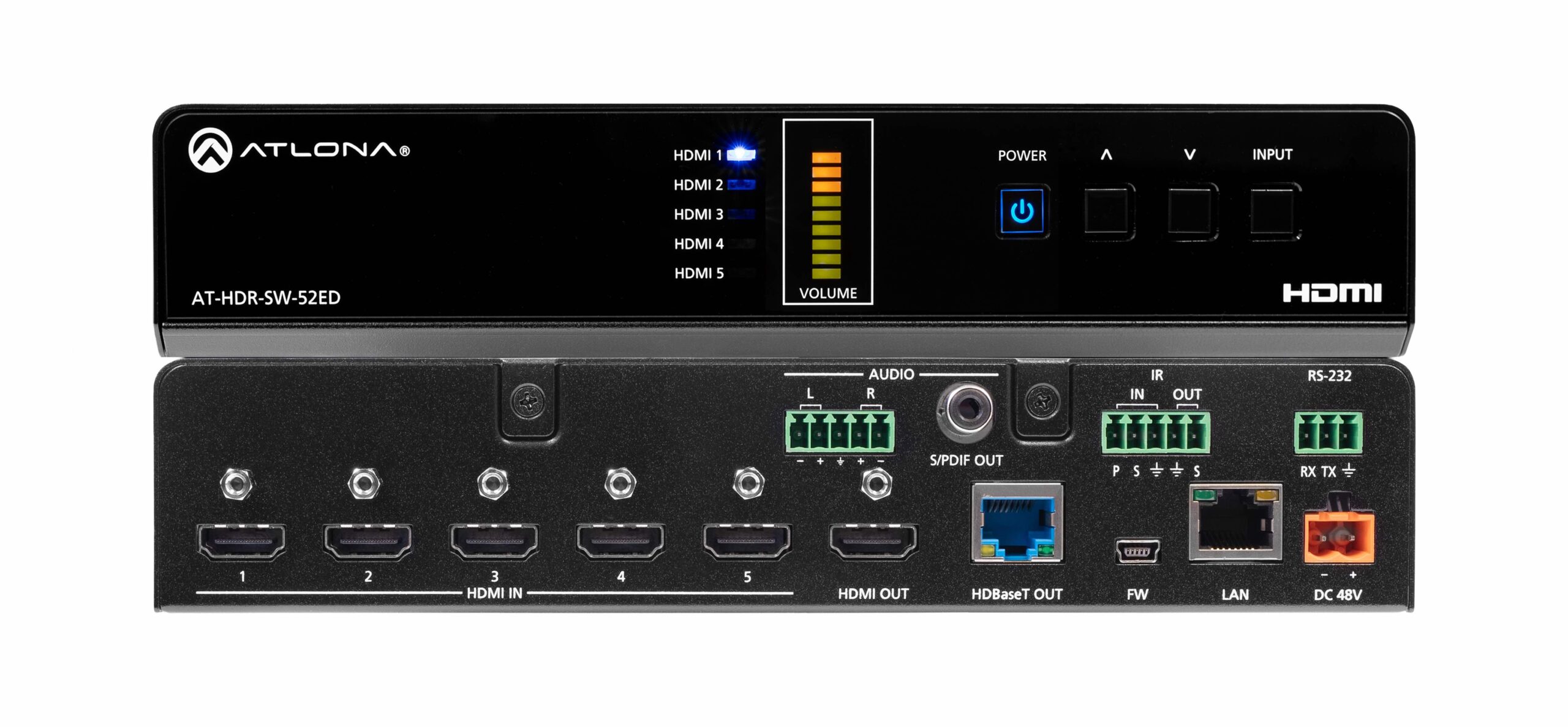 - AT-HDR-SW-51(one HDMI output) – An ideal choice for conference rooms and meeting spaces, the HDR-SW-51 can also feed larger, multizone distribution platforms such as Atlona’s OmniStream AV over IP systems.