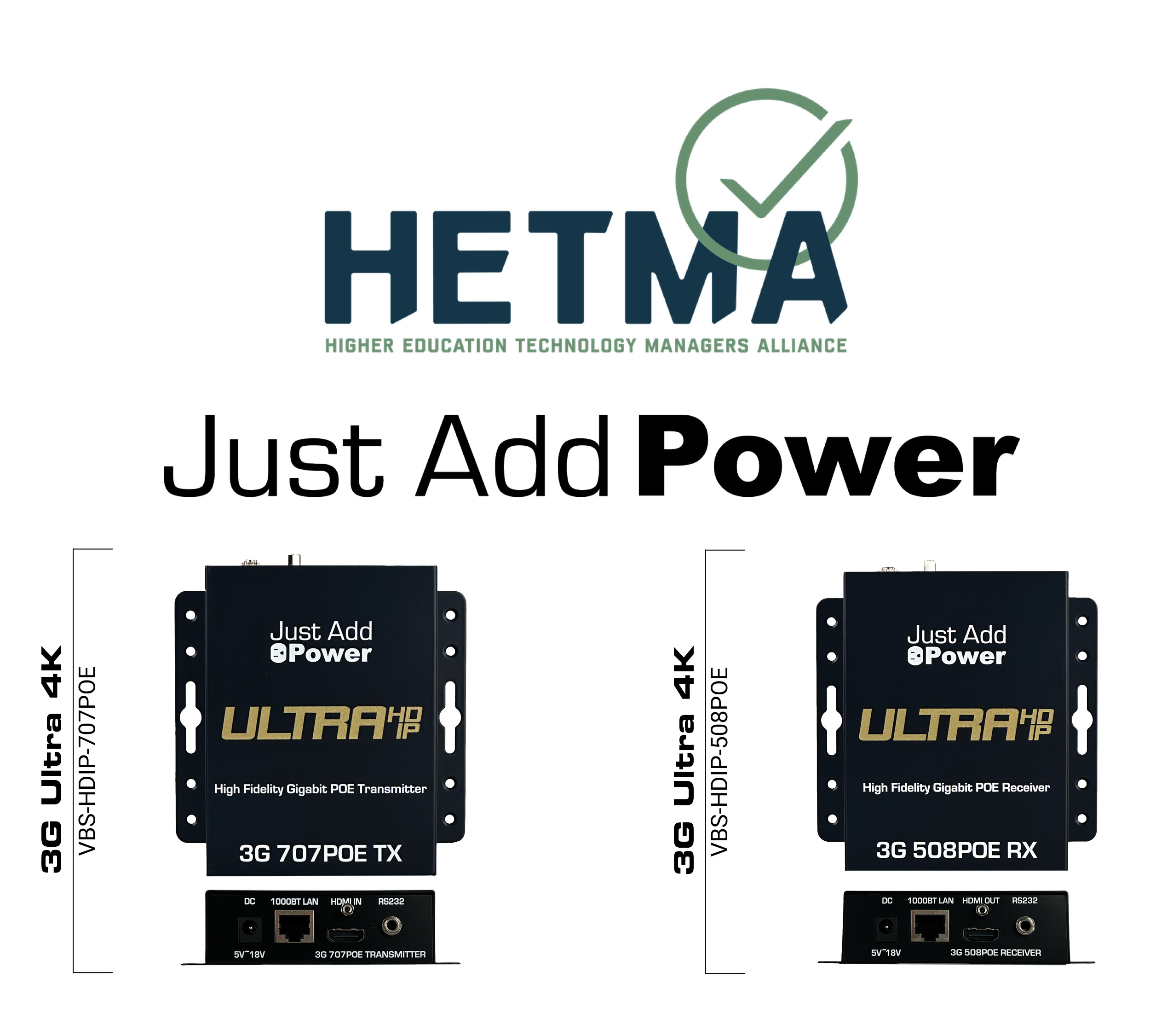Just Add Power, a leader in AV-over-IP distribution, today announced that its 3G Ultra 508POE receiver and 3G Ultra 707POE transmitter have received approval from the Higher Education Technology Managers Alliance (HETMA). The HETMA Approved Program takes products submitted by manufacturers and places them in real-world environments across its membership demographic. This certifies that the products meet the quality and service standards set by HETMA and that they fit in the higher education environment.