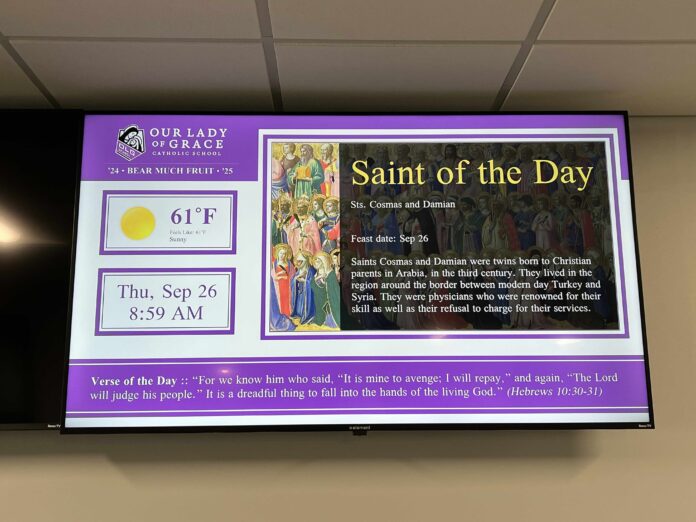 Carousel Digital Signage has helped Our Lady of Grace Catholic School, a PreK-8 school serving students in the Edina, Minnesota area transition from a PowerPoint program to a Carousel Cloud network, providing a professional digital signage experience to students, faculty and visitors as they move through the building. The Carousel Cloud network is now live on 10 screens in hallways, offices and common areas, with an additional five or more end points expected through the end of the 2024-2025 school year.