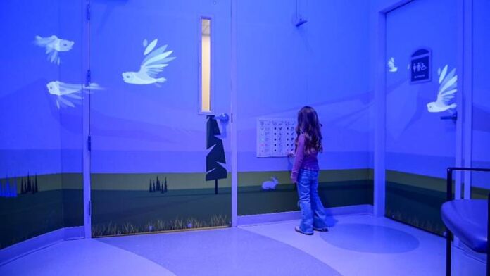 “When the children enter the space, they are in a hallway entry with decorations on the wall, setting the stage for the experience,” said Daniel Marx, burn clinic nurse manager, Children’s Mercy. “This is where they can customize their treatment, choosing the light colors on the ceiling, the flying birds on the wall and the music in the room. Whatever they chose is projected into the treatment room.”