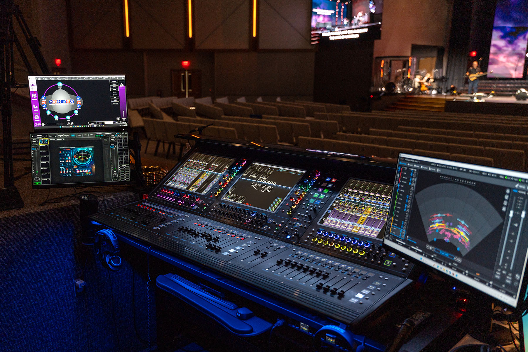 After a quick download and simple installation, the church’s worship band, vocalists, and orchestra members now have access to a greater number of inputs for their IEM mixes—up from :vokal’s initial input count of 24 to 64—connected via a Dante network. And while the singers and instrumentalists onstage are enjoying immersive monitoring, the entire congregation is also experiencing its own panoramic sound via an L-Acoustics L-ISA system installed by MG Systems, which also put a DiGiCo Quantum338 console into place at front of house.