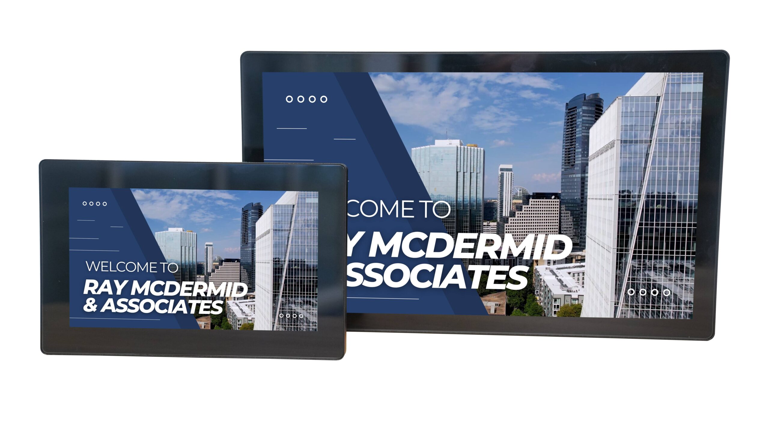 Two display sizes are available: a compact 11.6‑inch model, ideal for installation outside meeting rooms, and a larger 21.5‑inch display suited to broader corporate communications. Typical use cases include meeting room status displays, welcome signage, corporate announcements, event information and live data feeds.