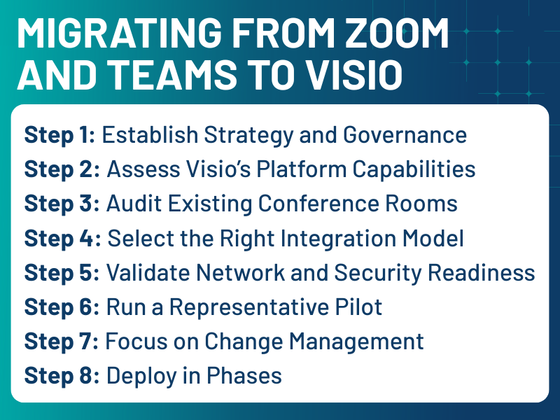 This article outlines what you need to consider when migrating from Zoom Rooms and Microsoft Teams Rooms to a new platform like Visio, and how to do it without disrupting productivity.
