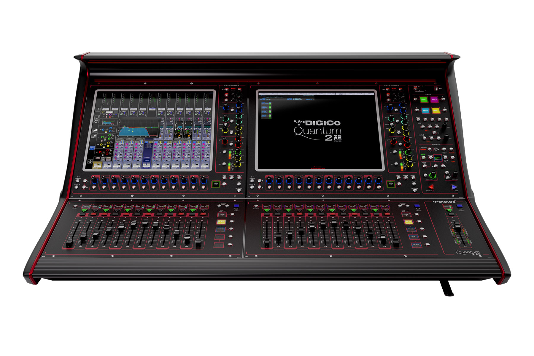 Whereas the standard Quantum225 features a left-panel bracket to accommodate a channel or overview screen, KLANG:kontroller, or laptop, the Quantum225 DS is equipped with two 17-inch, full-color, daylight-bright TFT multitouch screens for enhanced workflow functionality and control.